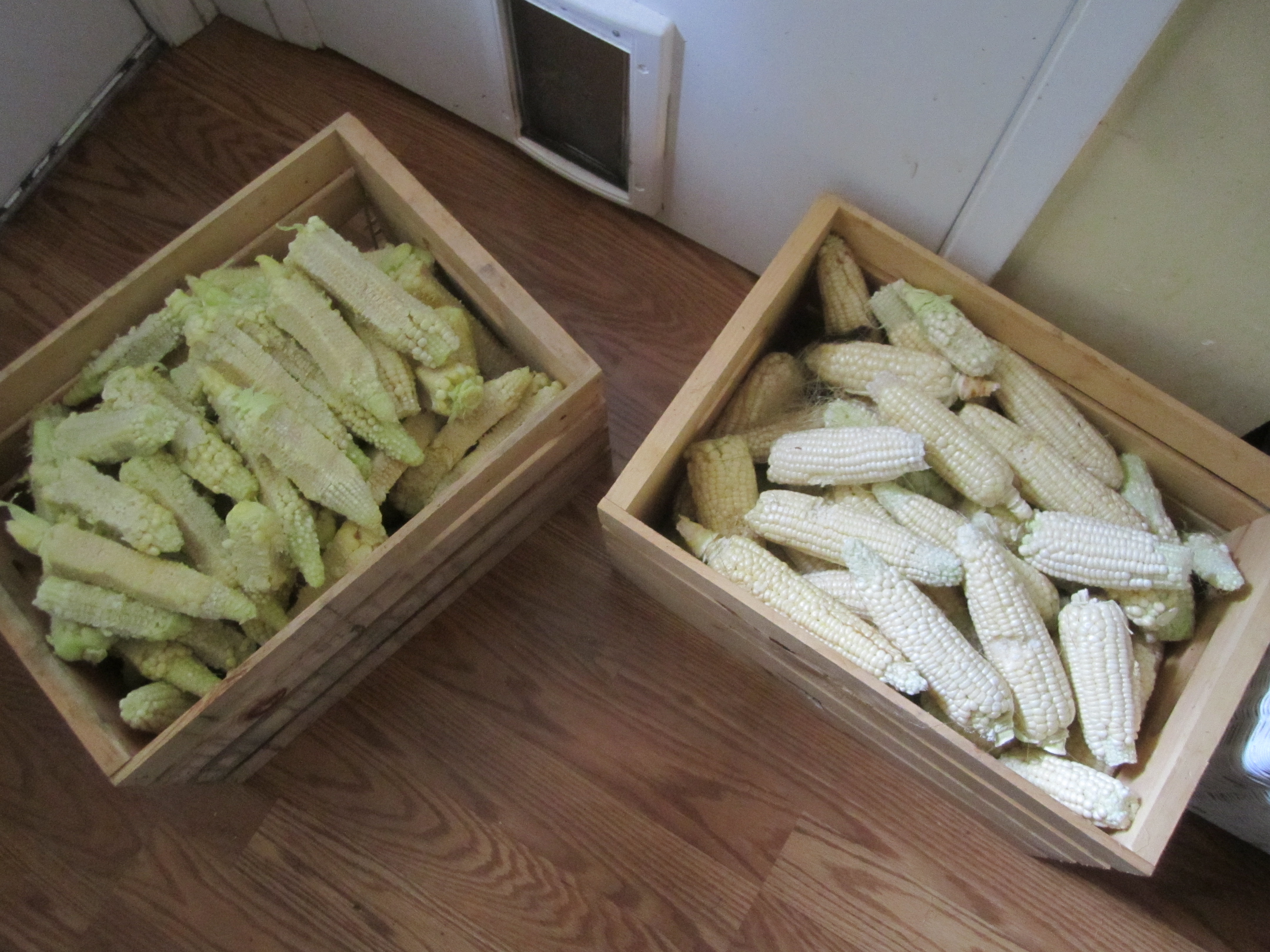 Take two with the corn. No excuses this time – I have taken the summer off and we’ve been down in the garden a lot. We kept taste-testing the corn, and it wasn’t looking so good, again. Finally, I noticed a trend: they were starting to get a little less awful. So, today, when I picked one that tasted halfway okay, I decided it was time. Harvested the whole lot. Five big crates full.